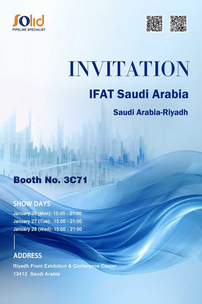 Estamos encantados de anunciar que Solid estará exhibiendo en IFAT Arabia Saudita en Riad, y nos encantaría conocerlo en el stand 3C71. únete a nosotros durante los días de la exposición, del 26 al 28 de enero (15:00-21:00), en el Centro de Exposiciones y Conferencias Riad Front para explorar oportunidades de colaboración, ver nuestras últimas soluciones de tuberías y discutir cómo podemos apoyar sus proyectos.